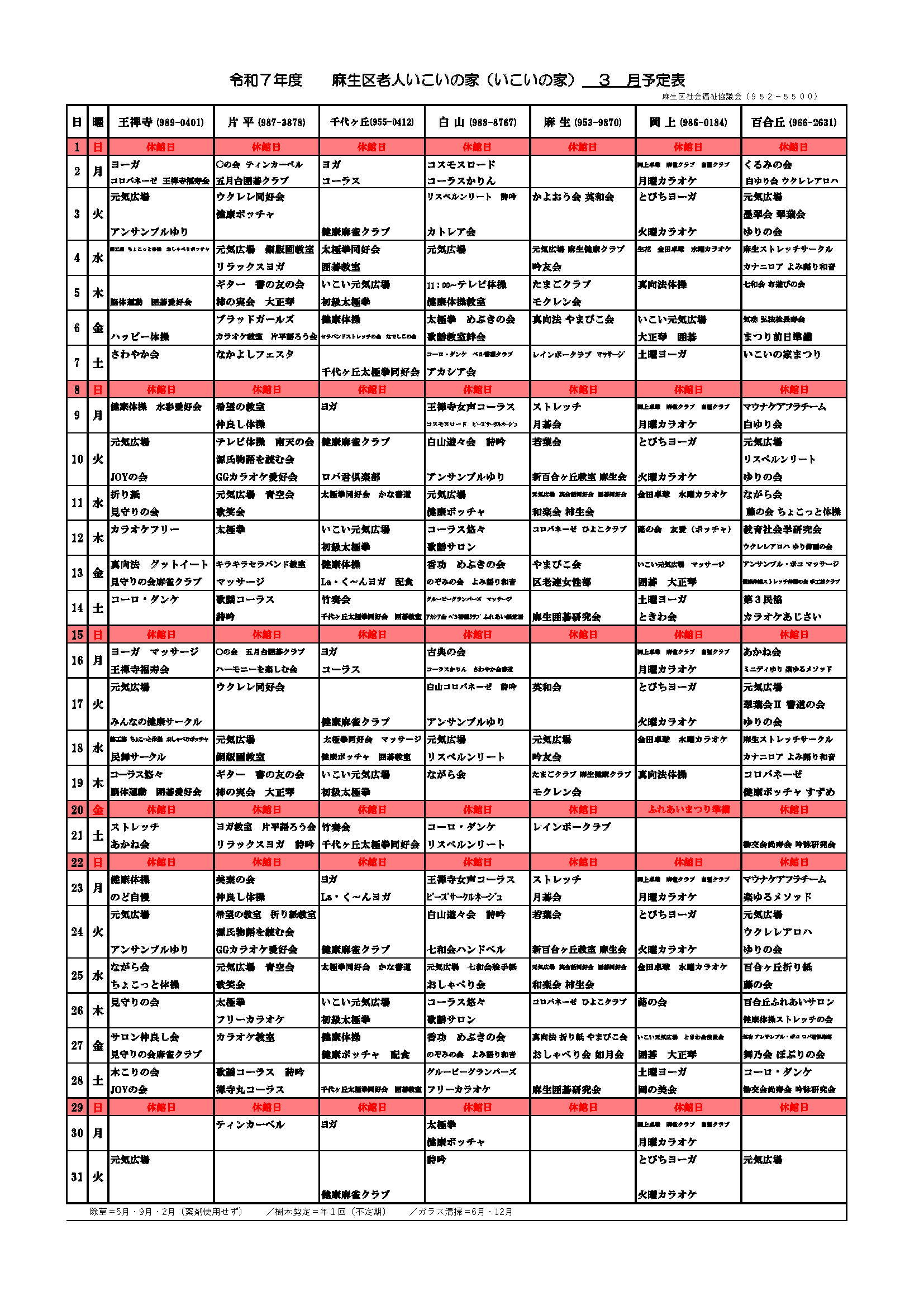 ホーム » いこいの家 » 麻生区老人いこいの家3月予定表