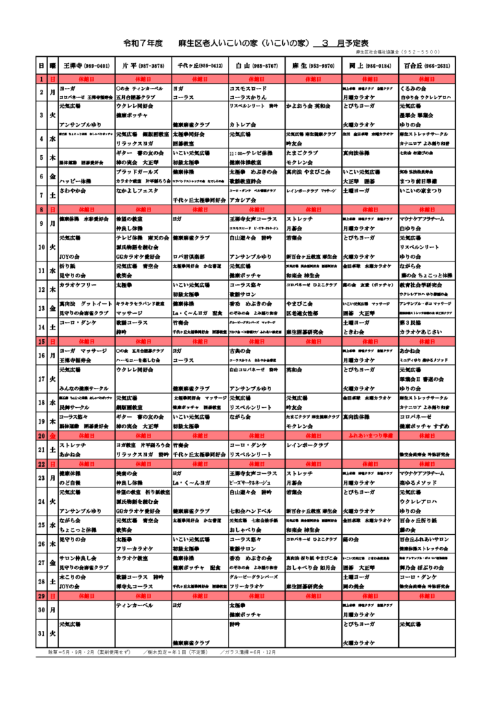 麻生区には7つの老人いこいの家(愛称:いこいの家)が設置されており、全館を麻生区社会福祉協議会が指定管理者として管理運営を行っています。